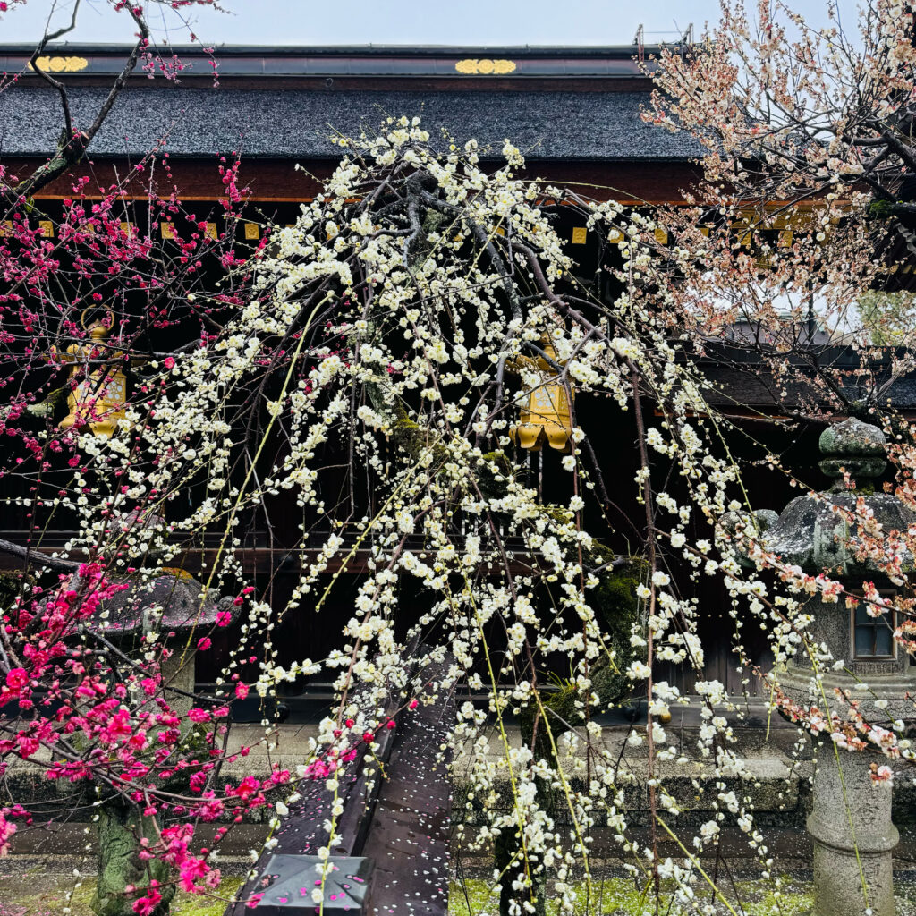 I went out for Hatsumode (New Year’s visit to a shrine) at this late date. Plum blossoms are already in full bloom at Kitano Tenmangu Shrine in Kyoto. Spring is just around the corner.