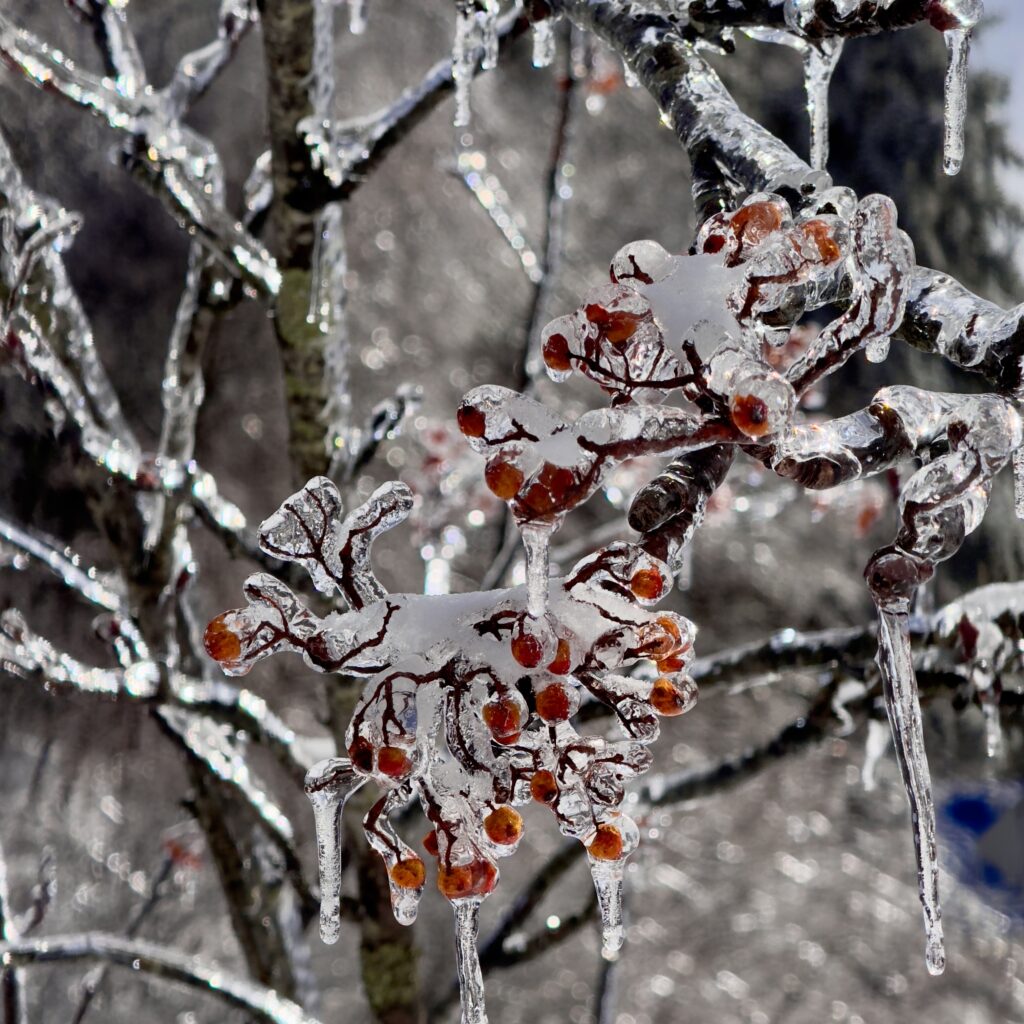 蓼科にいます。雨氷という珍しい現象で、過冷却された雨が地表に落ちてきた瞬間、樹々を凍らせます。日が当たって溶け始めるとまるでガラス細工みたいです。その造形美に鳥肌が立ちます。