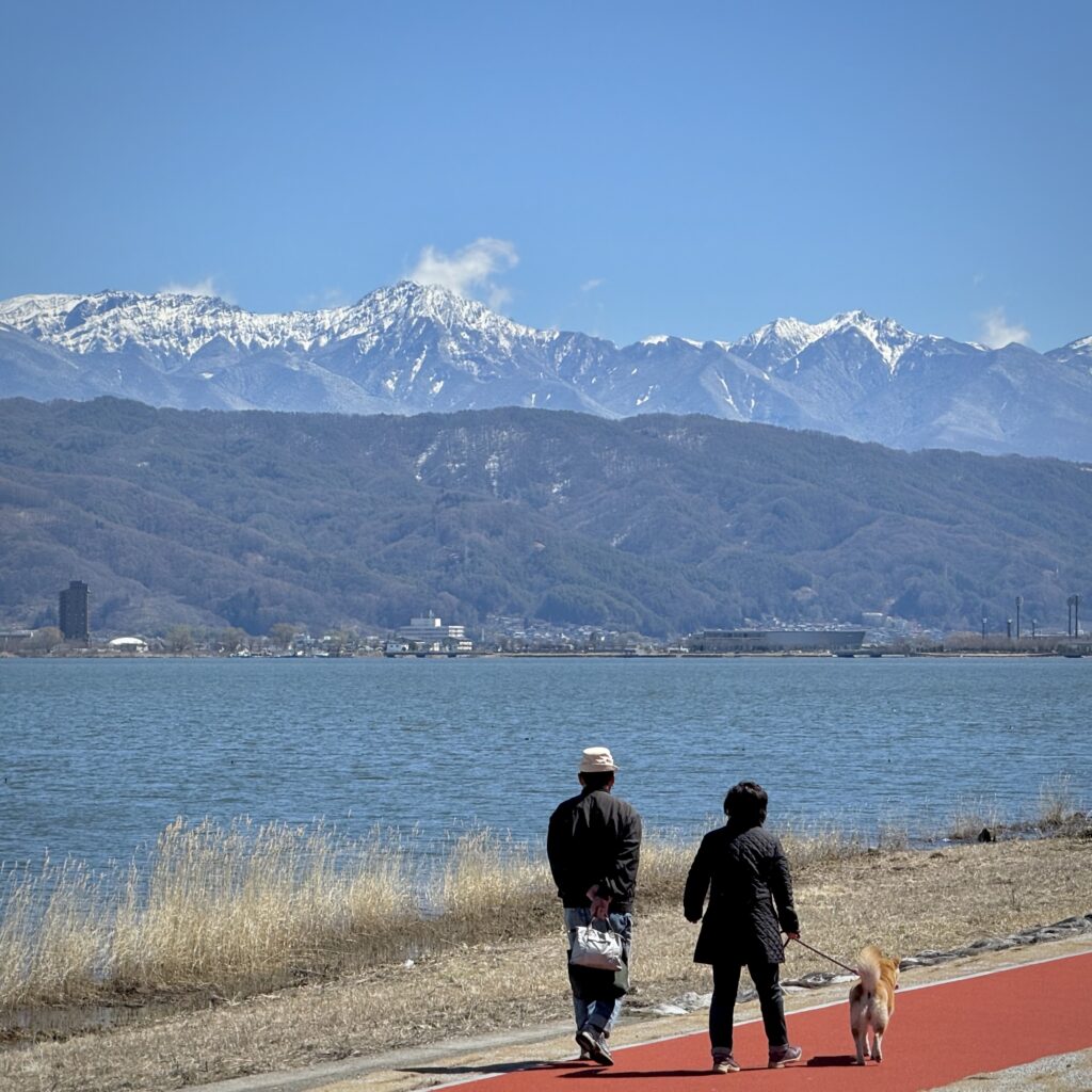 雪解けも進みました。諏訪湖畔を自転車で巡りました。遠くに雪をたたえた北アルプスが見えています。