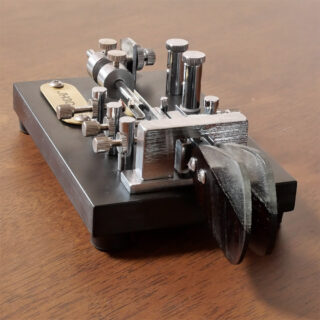 どうやら、画像生成AIのMid journeyは電鍵という概念を理解できないらしい。いくら呪文を工夫しても電鍵らしきものは生成されません。苦し紛れに出されたものがこれです。木の台座上に真鍮で構成された謎の装置。側面に張られた使い込んだ皮の風...